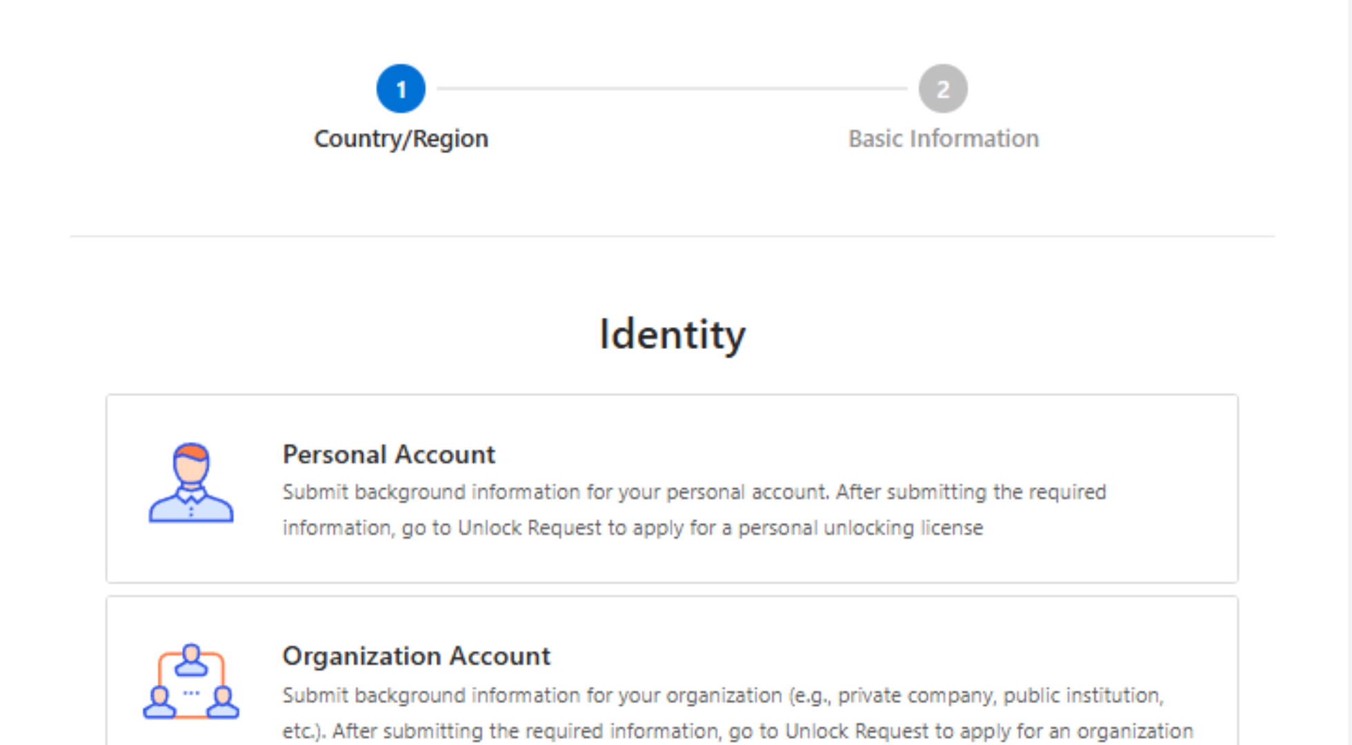 Choose your identity type (Personal, Organisation, or Government) and Country/Region.