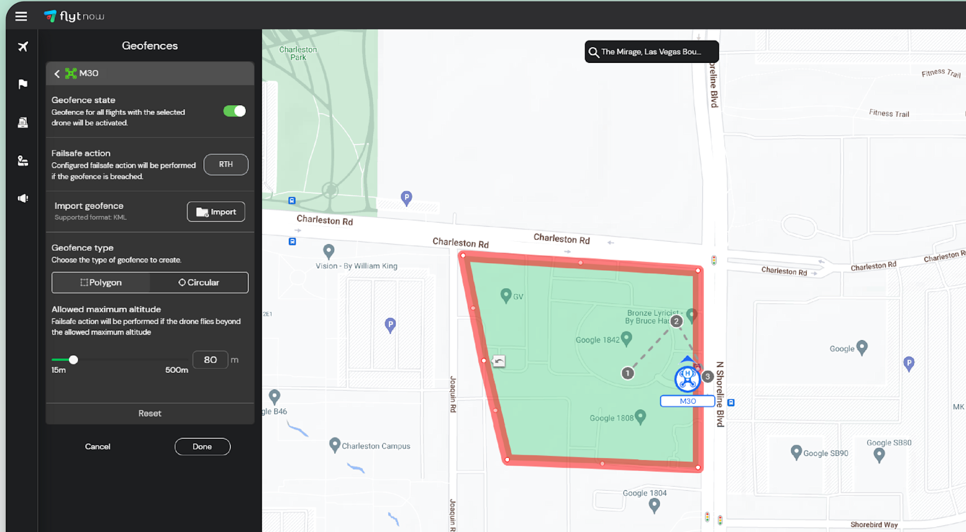 Also set geofence failsafe actions for the drone, such as land, hover, continue, and return to the docking station - in the event of a geofence breach.