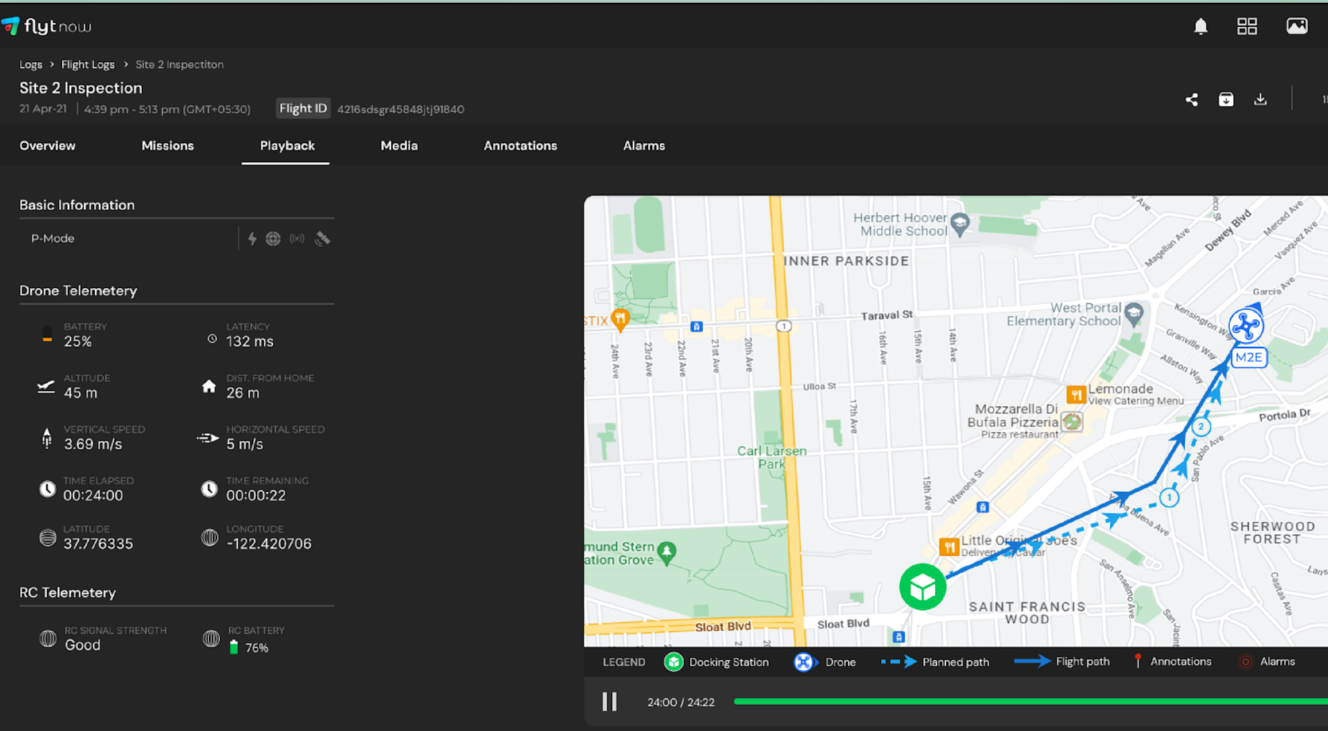 These flight logs consist of several sections, such as Overview, Playback, Media, Annotations, and Alarms, helping to build a picture of the entire mission and facilitating reviews of important information.