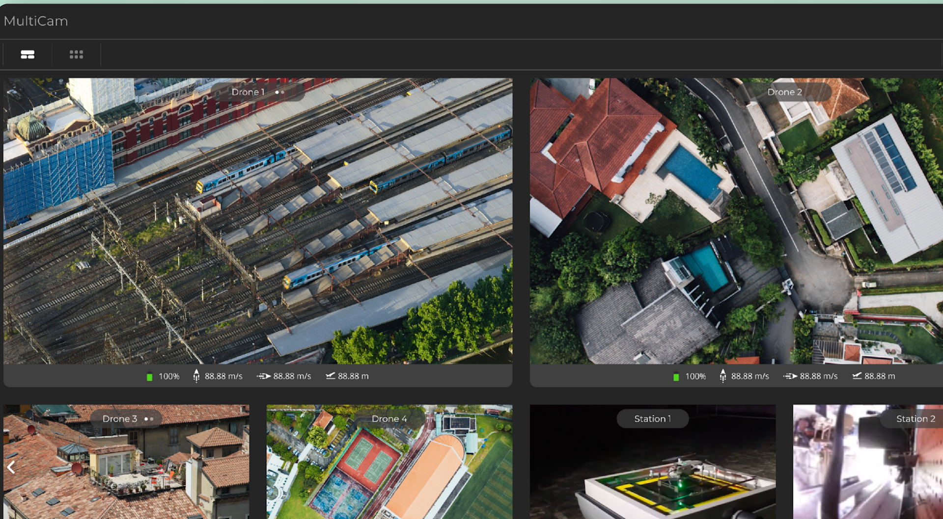 The operator can access the live video feed from multiple drones which are executing simultaneous missions by switching to Multi-Cam Video Feed.