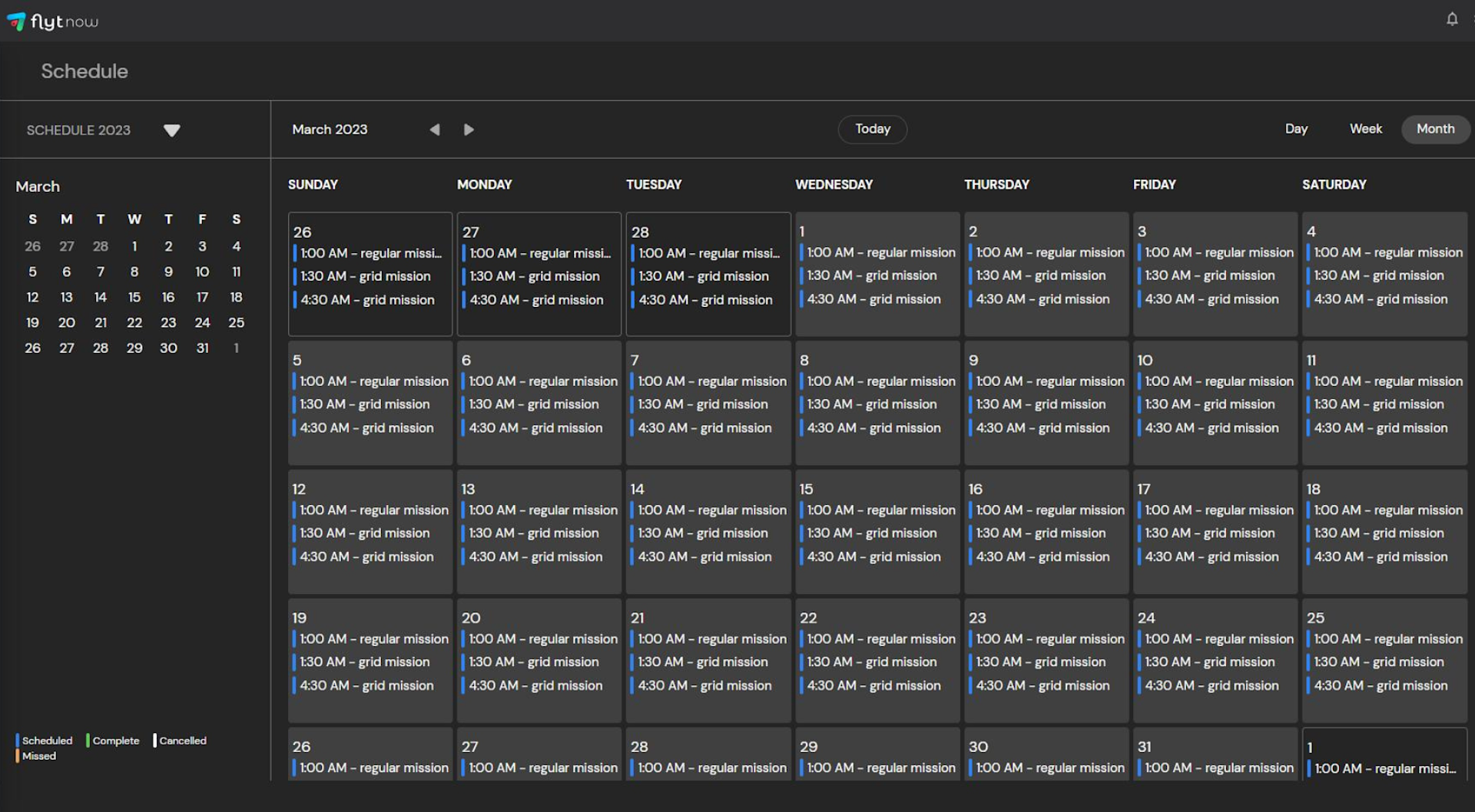 The FlytNow dashboard features a calendar screen that displays the pre-planned flight schedule of the drone fleet. This enables missions to be planned through the day, week, and month tabs.