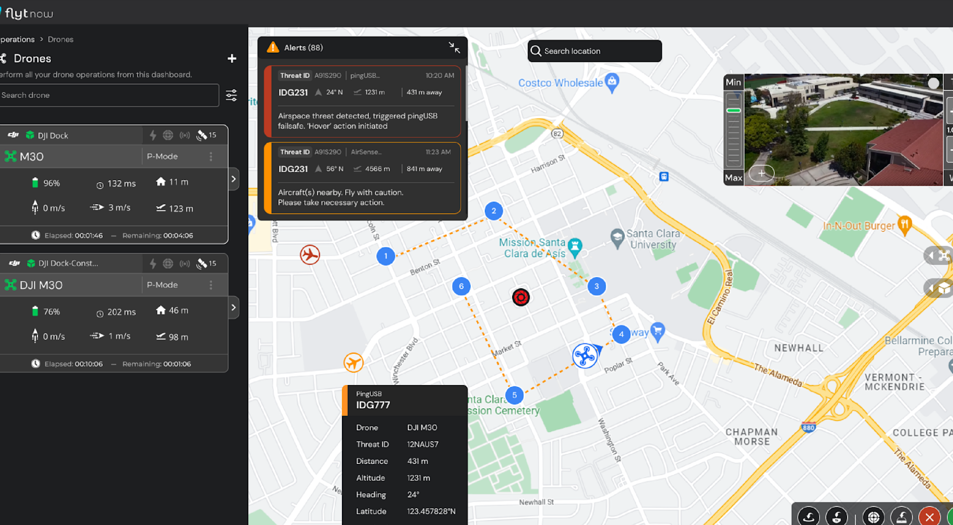 Video Streaming: Live video can be seen on the top right window of the FlytNow dashboard, which is its webpage cockpit view.