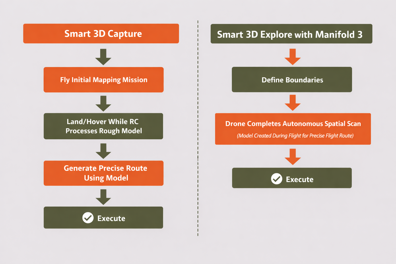 Smart 3D Explore with Manifold 3: Define boundaries > drone completes autonomous spatial scan (model created during flight for precise flight route) > flight route execution > survey quality report.