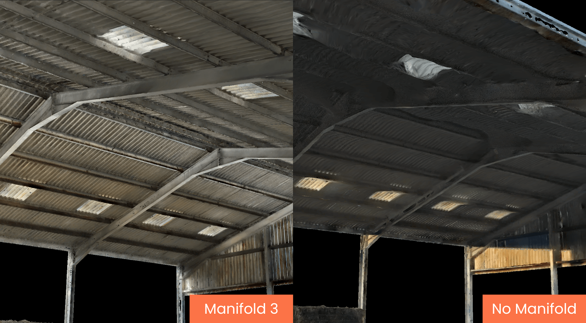 Real-world tests: Manifold 3 produced more complete models, due to its ability to capture parts of you site that otherwise would not be seen using normal smart 3d capture, demonstrating how it excels in complex or constrained environments.