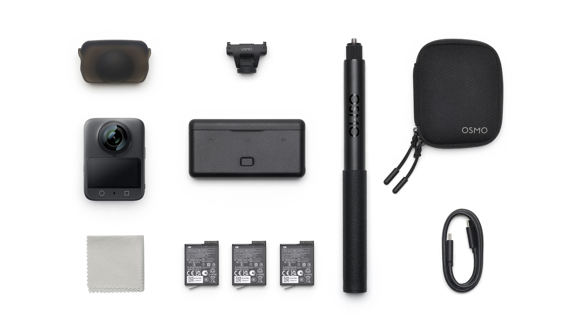 Osmo 360 Adventure Combo: Ideal for extended shoots, this combo includes the Osmo 360, three Extreme Battery Plus units, a multifunctional battery case, an adjustable quick-release adapter mount, a 1.2m invisible selfie stick, and essential accessories.