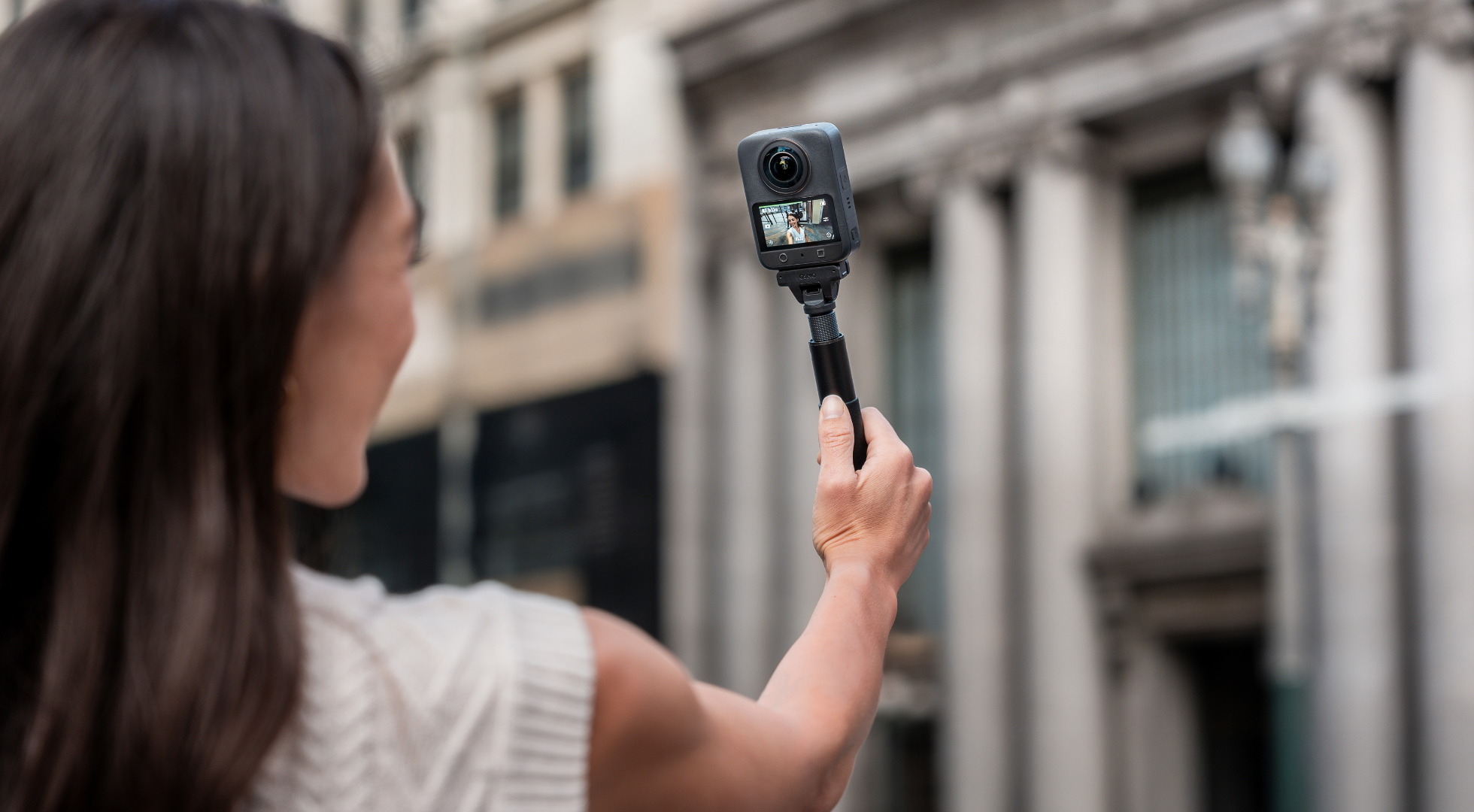 When paired with the invisible selfie stick, the stick won’t show in your 360° shots — no editing needed. It looks like you have your own floating camera following you.