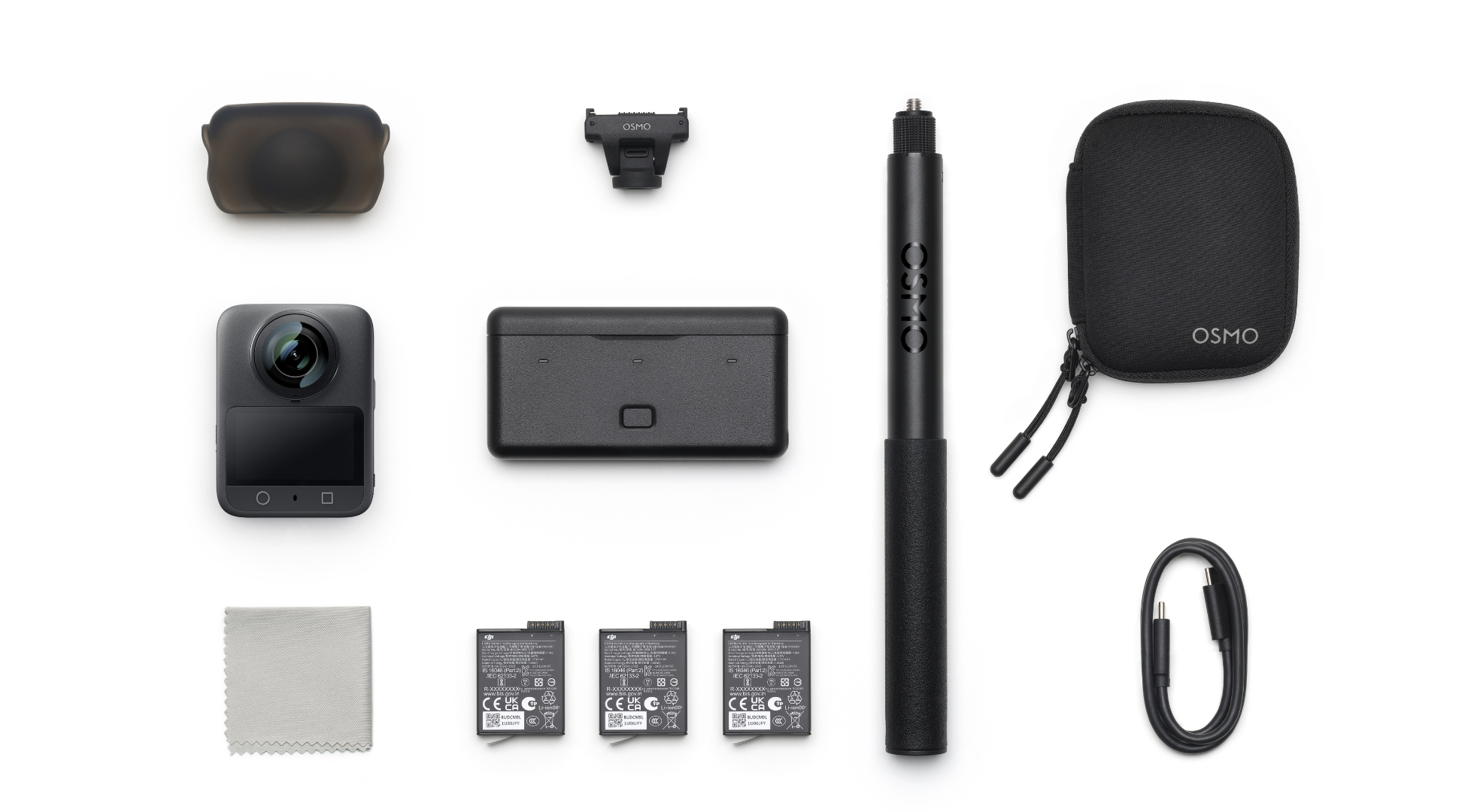 Osmo 360 Adventure Combo: Ideal for extended shoots, this combo includes the Osmo 360, three Extreme Battery Plus units, a multifunctional battery case, an adjustable quick-release adapter mount, a 1.2m invisible selfie stick, and essential accessories.