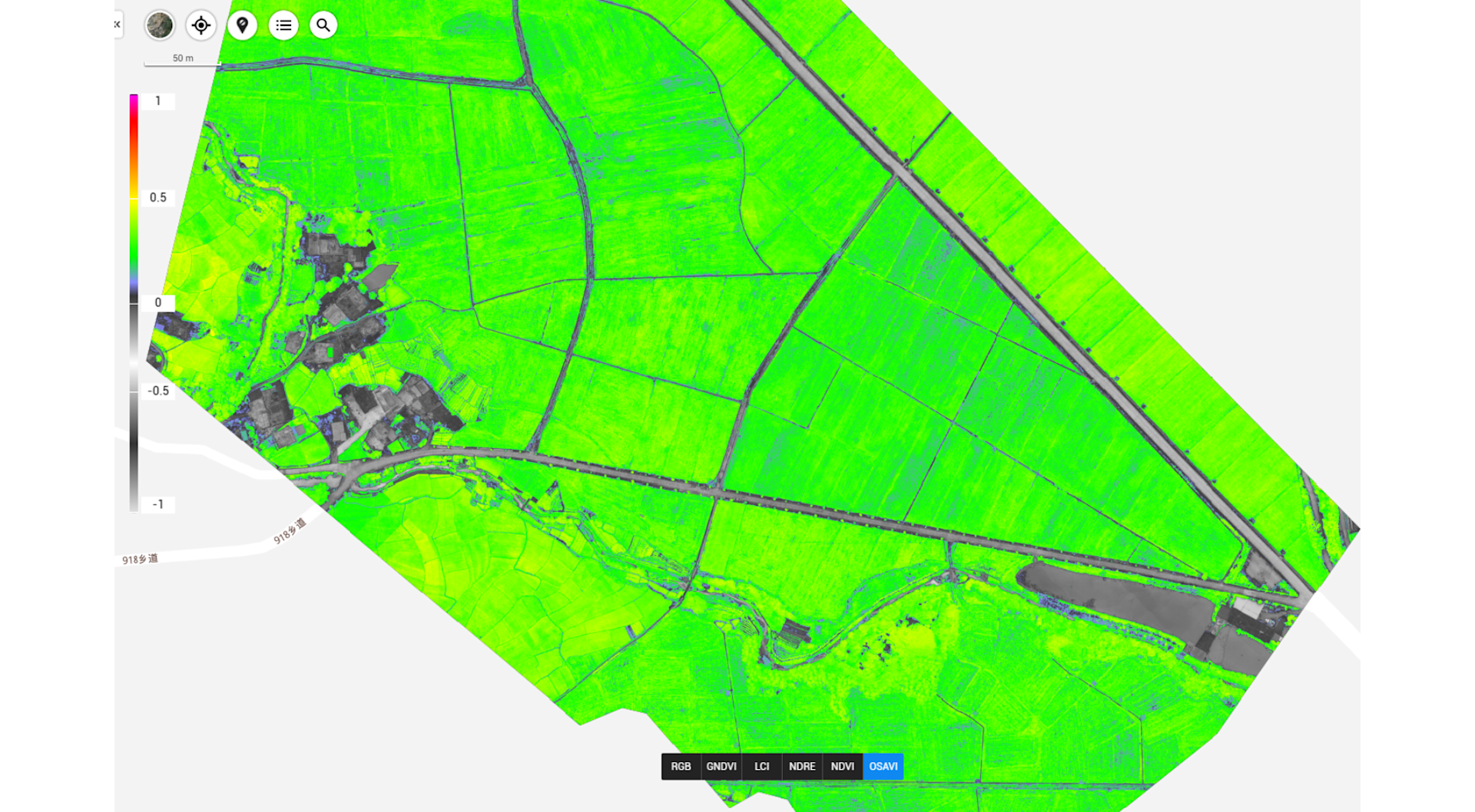 OSAVI values can range from -1 to 1. High OSAVI values indicate denser, healthier vegetation, whereas lower values indicate less vigor.