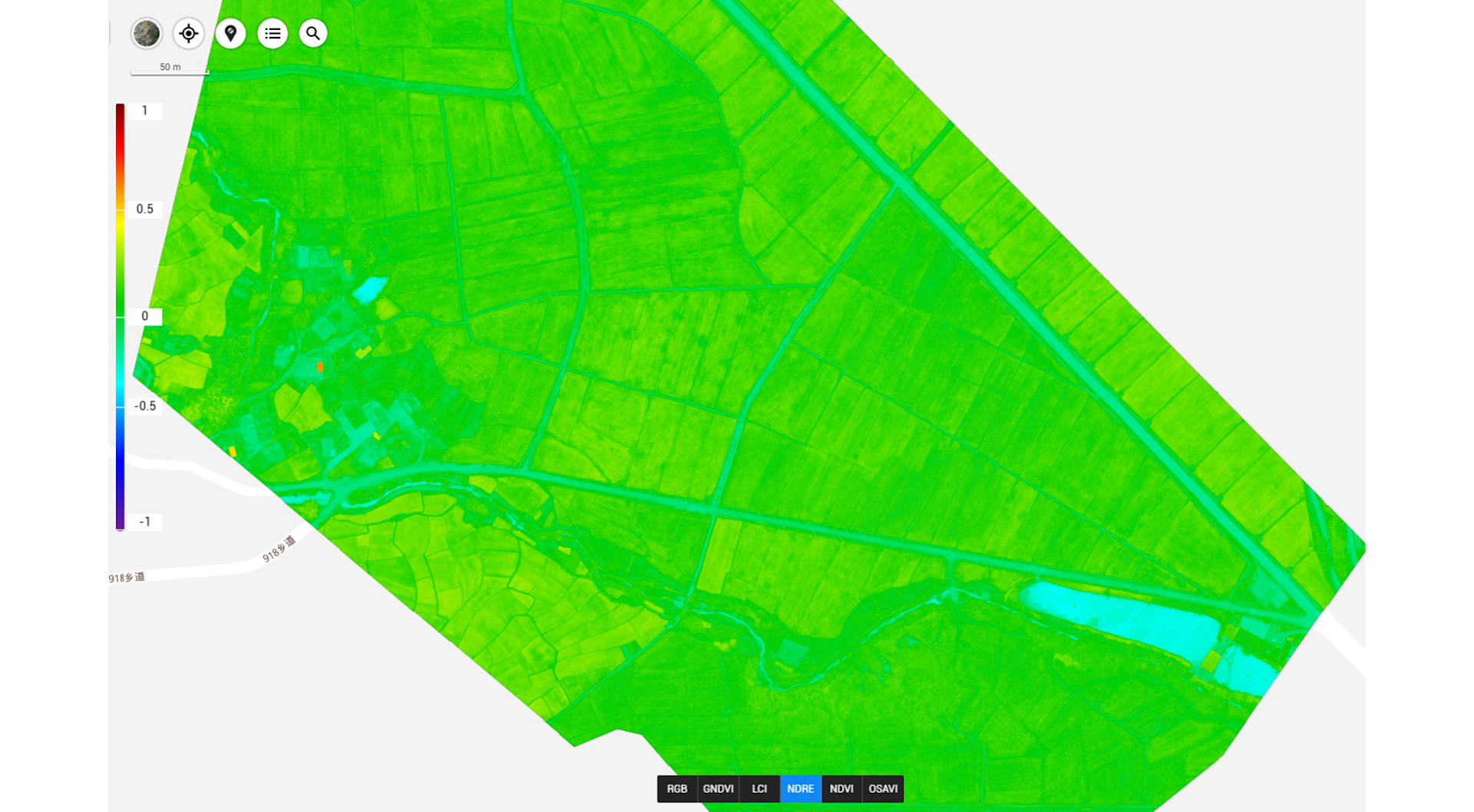 High values of NDRE represent higher levels of leaf chlorophyll content. Soil typically has the lowest values, unhealthy plants have intermediate values, and healthy plants have the highest values.