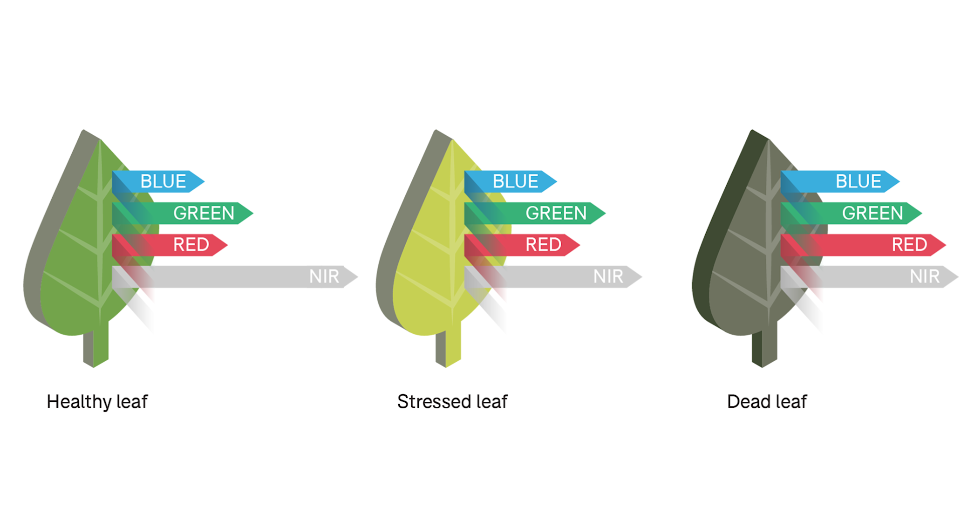 For example, healthy plants reflect a smaller quantity of red light but a larger amount of near-infrared light (which humans can't detect, but multispectral imaging can), whereas the opposite is true for stressed or dead plants.