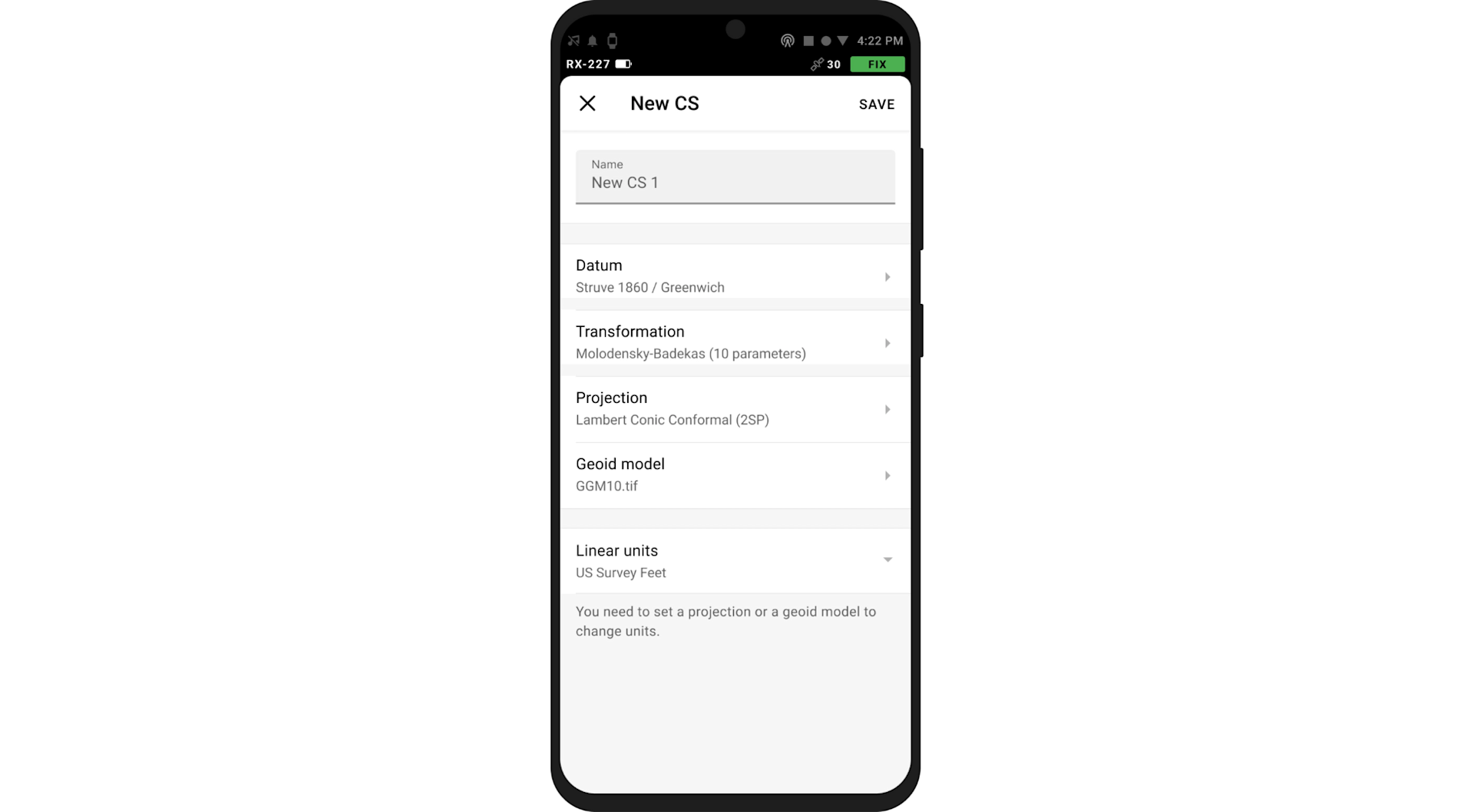 Emlid Flow has a wizard for manual coordinate system creation for areas without a predefined coordinate system. To start your survey, you just need to specify the datum, enter transformation parameters or projection, and choose your geoid.