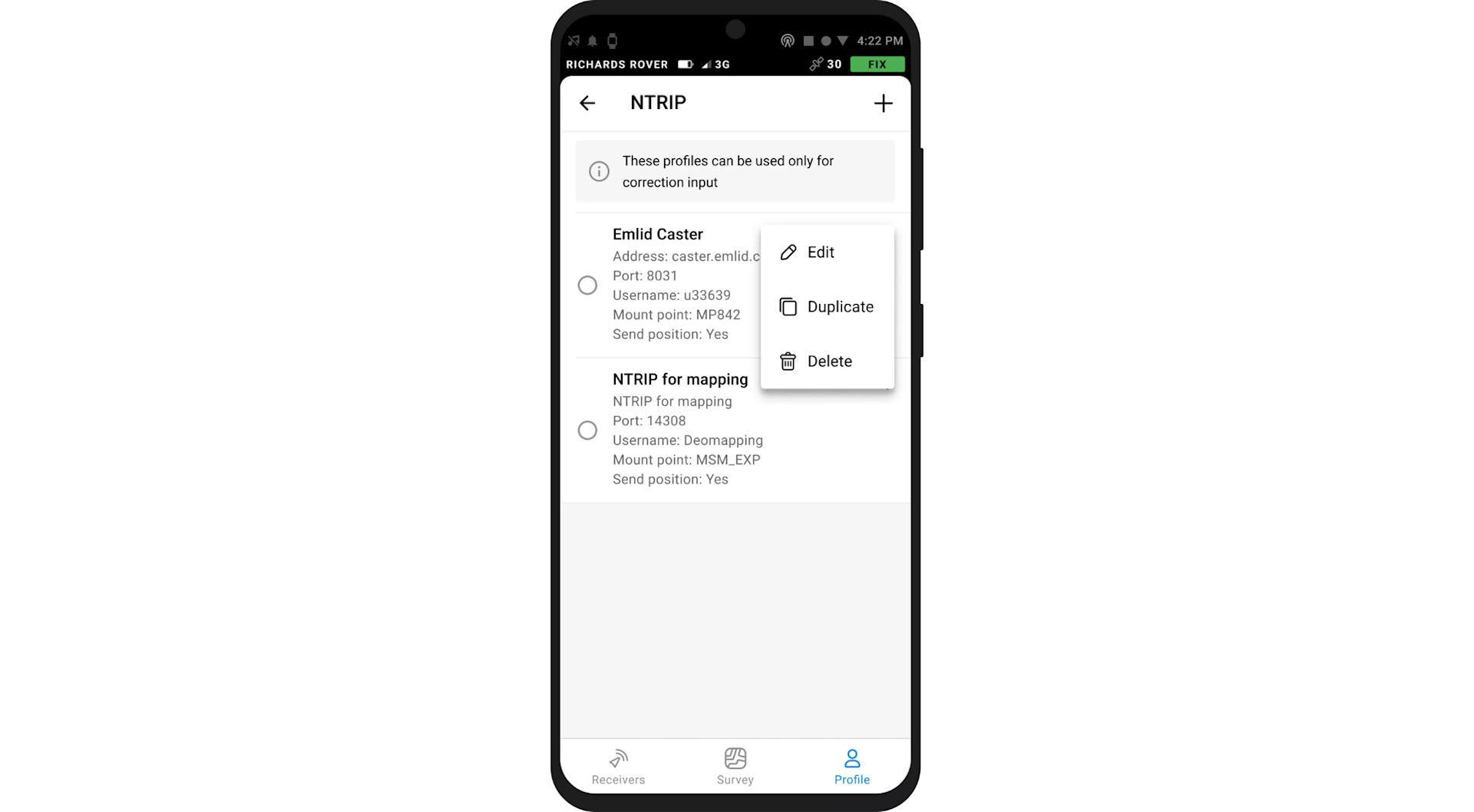 Store all accounts for NTRIP services in one place. You can use the same correction input settings for several Reach units after only entering the credentials once.