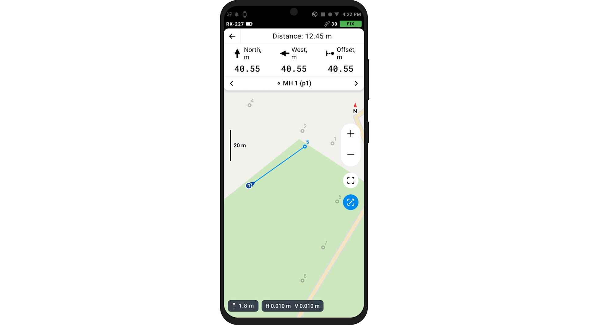 Emlid Flow displays East-North and straight-to-line distances and supports cut and fill indication. When you get close to a point, the indication switches to a close-up alignment mode helping you to centre exactly above the point.