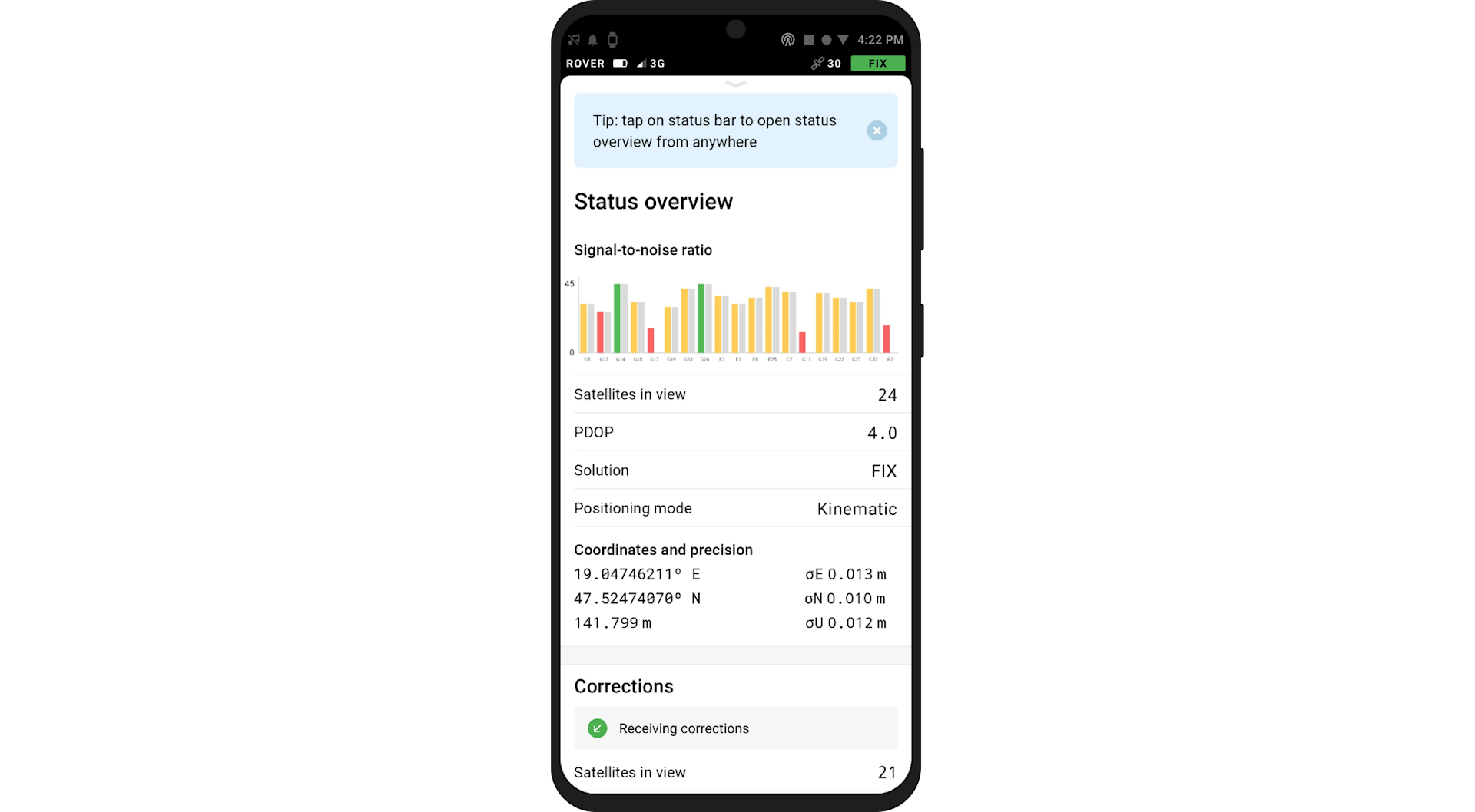 All the necessary status information is available at your fingertips: Satellite reception, solution status, modem reception, corrections stream state, and battery charge level.