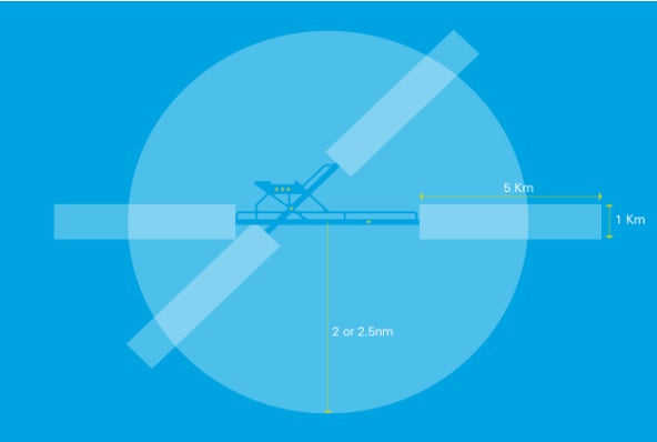 Runway Protection Zones: A rectangle extending 5Km from the threshold of the runway away from the aerodrome, along the extended runway centreline, and 500m either side - also to a height of 2,000ft above ground level.