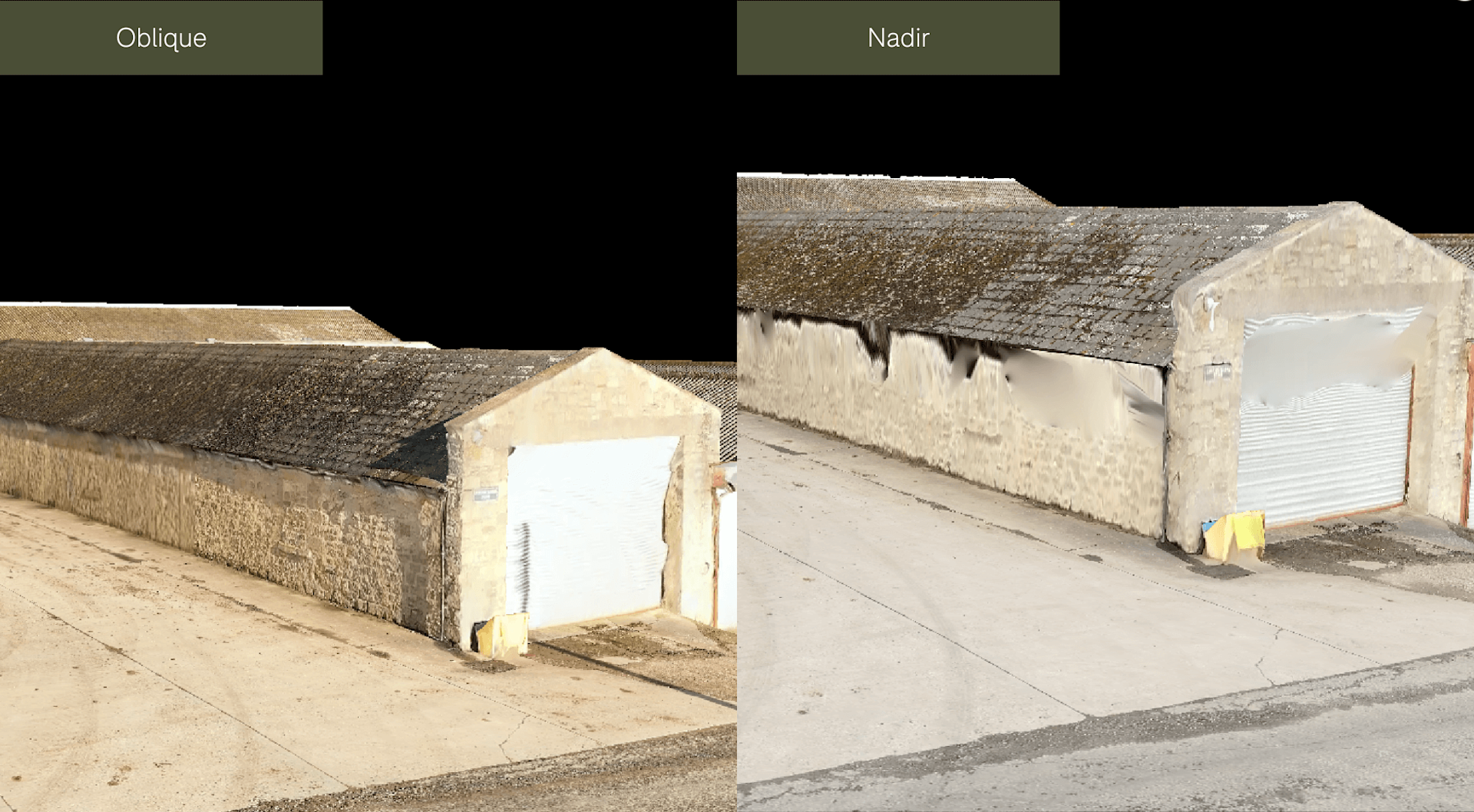 This comparison image - captured with the DJI Zenmuse P1 photogrammetry camera - demonstrates the advantages of using oblique imagery for 3D modelling, compared to just nadir imagery.