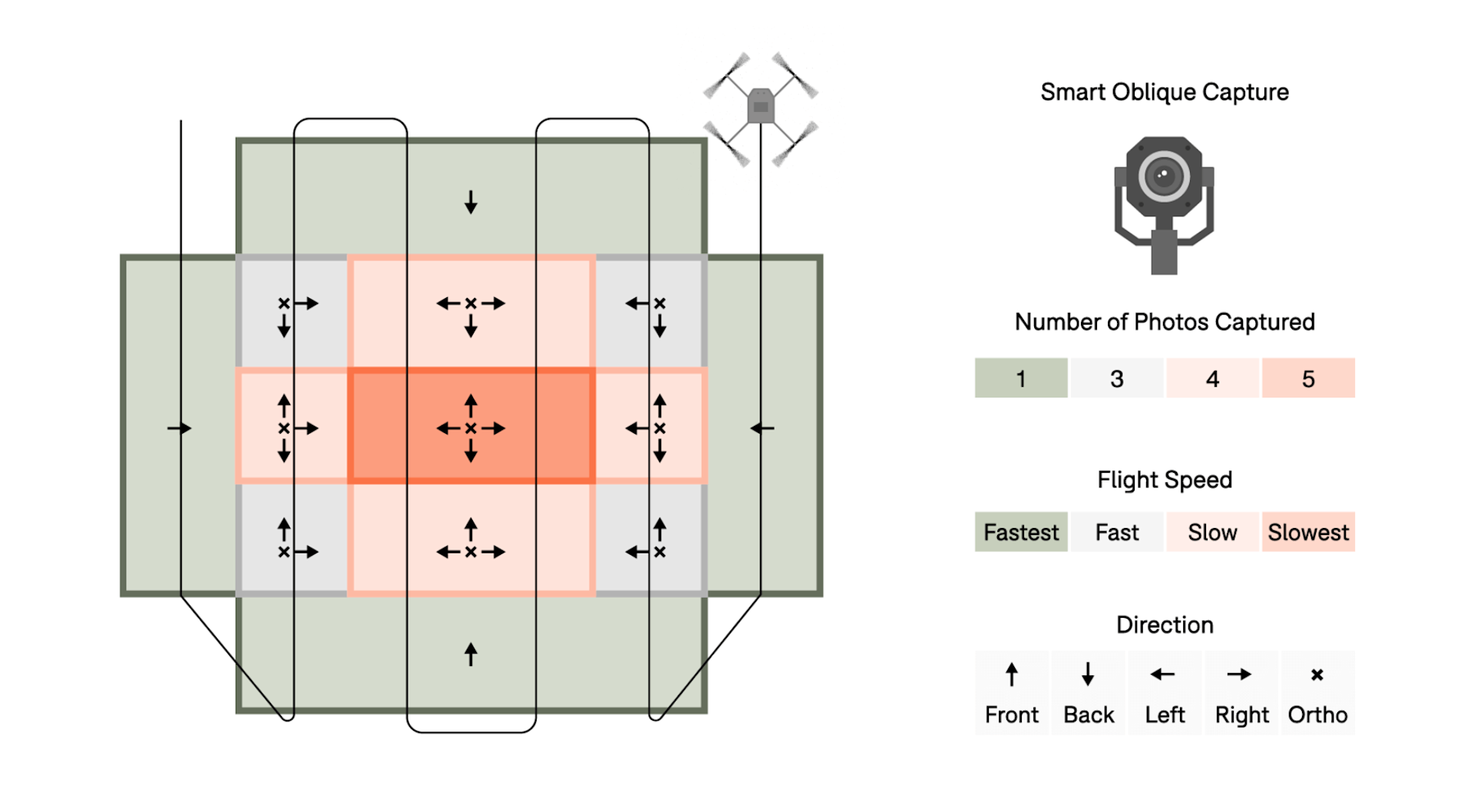 With Smart Oblique Capture, the position data, drone speed, and gimbal direction are embedded into the metadata of each photo in order to compensate for the shift in position and perspective; similar to the mathematical calculations used to amalgamate the consecutive captures in an oblique camera array.