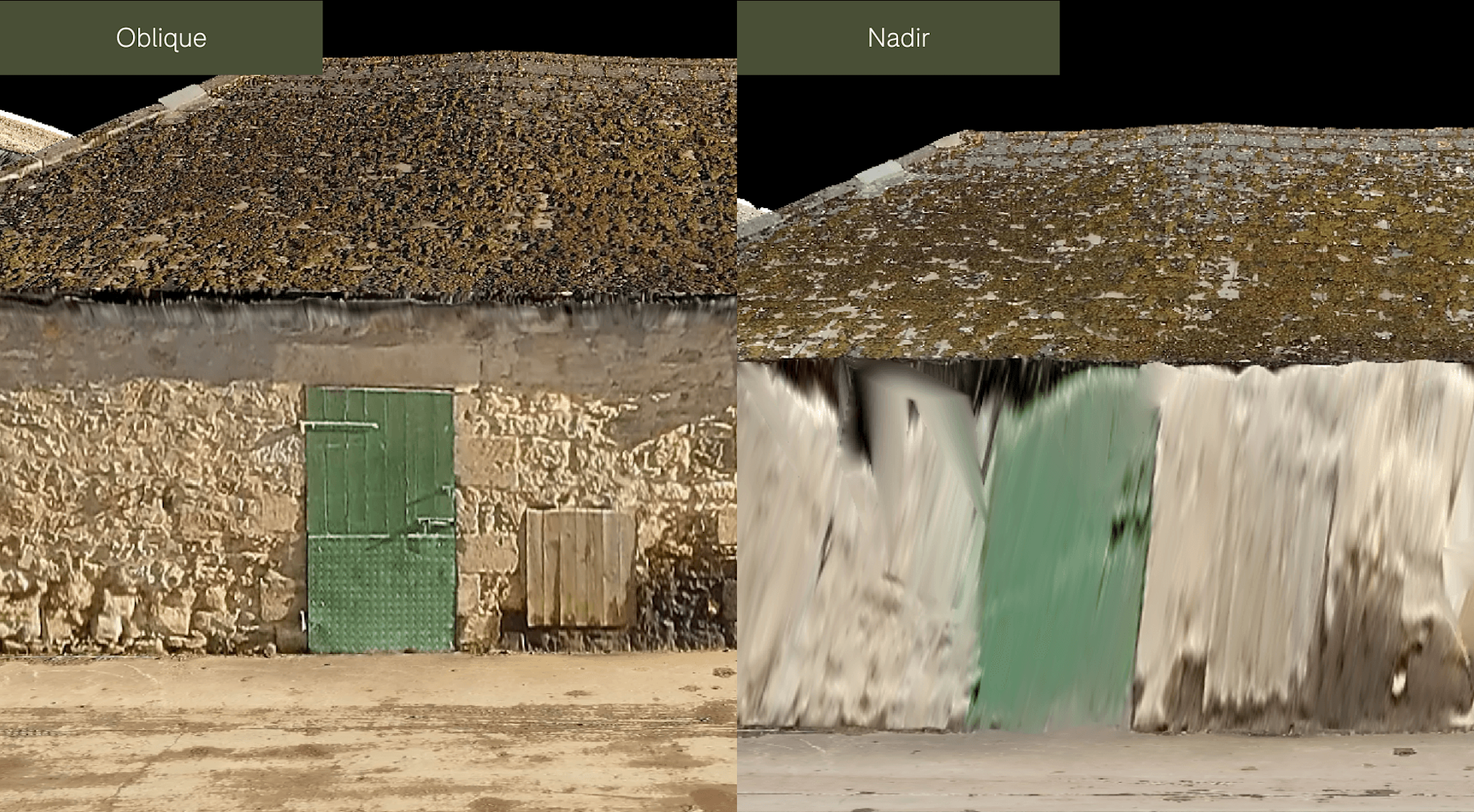 For instance, look at the increased level of detail on the model containing oblique imagery, compared to the dataset comprising only nadir imagery. In the oblique dataset, the wall and door and more defined and complete.