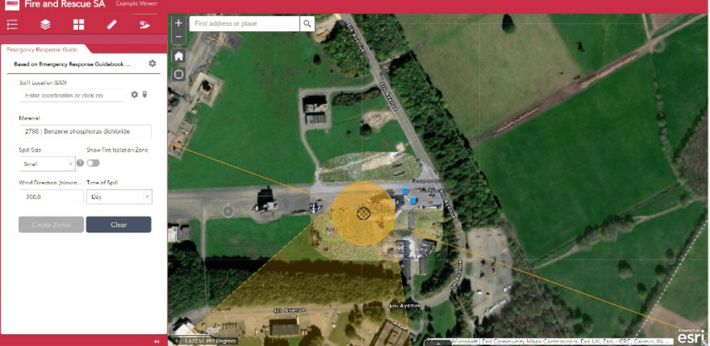 The map can then be used to highlight key information: In the above image, the diamond shows the area of the chemical spill, the orange circle shows the cordon, and the lines display the entry/exit points.