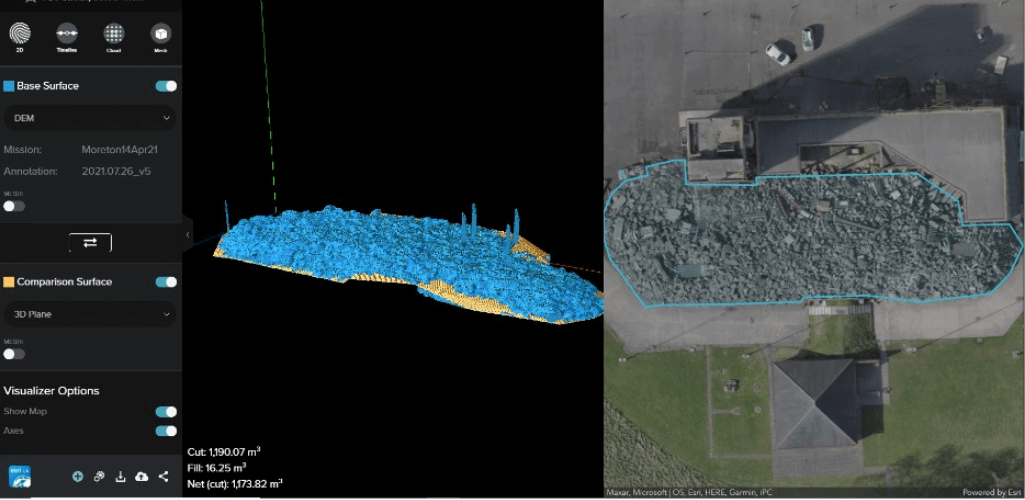This 3D model can then be used to conduct vital calculations. The below image shows how the software can calculate the volume of the debris. This provides insights such as the size and weight of the pile, and how long it would take to clear.
