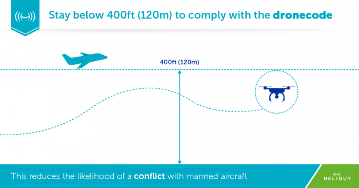 It is against the law to fly your drone over 400ft (120m). This reduces the likelihood of a conflict with manned aircraft.
