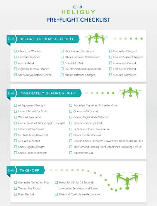 So, you're aware of the rules and regulations. Now it's time to carry out a pre-flight checklist. For more information, click here or see our guide below. We also have tips about flying in the winter and advice about batteries.