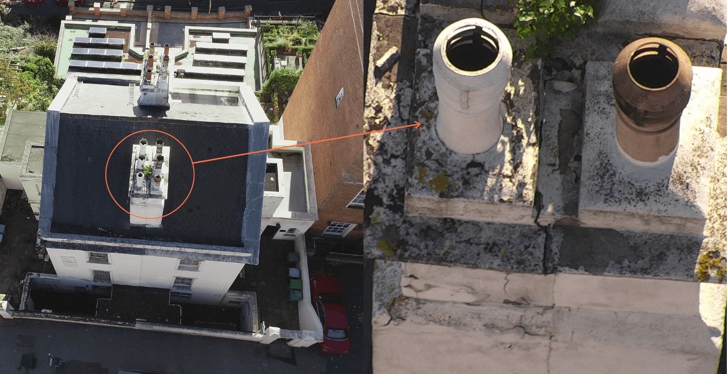 For example, Quayle Industries used the M210 V2 with the Z30 for this roof survey below. The image on the left shows the view from the drone, high above the building, while the second is a crystal clear picture of two of the chimneys, as captured using the zoom.