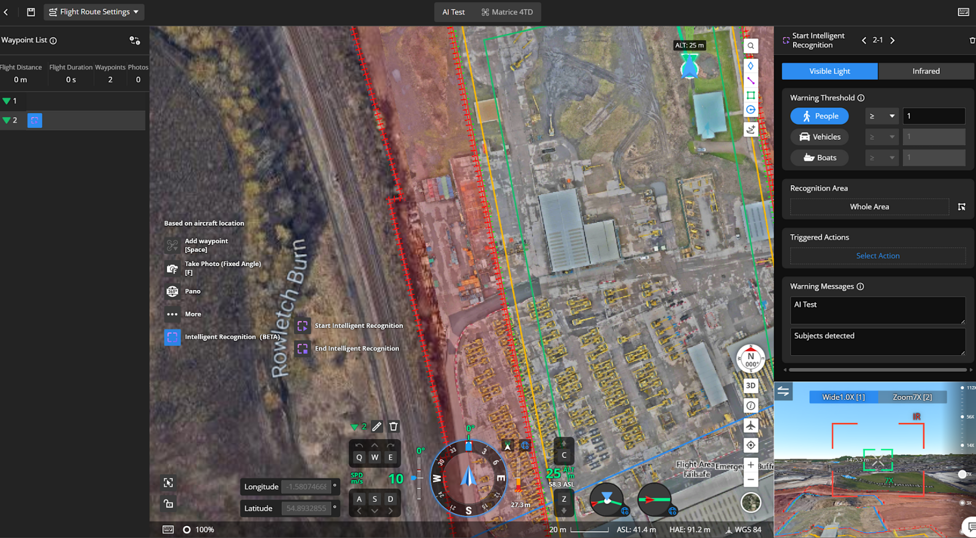 DJI FlightHub 2, Intelligent Recognition when programming Waypoint Missions. These routes support recognition actions capable of identifying people, vehicles, boats, or subjects displaying abnormally high or low temperatures.