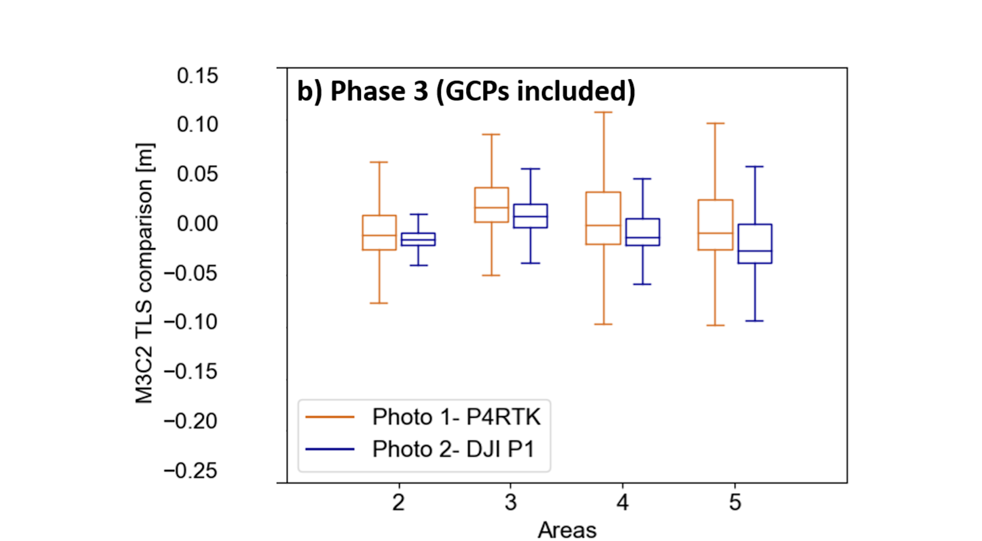 'Finally, in Phase 3, the introduction of GCPs returns the highest level of precision and accuracy (~1x GSD), albeit only slightly improved over Phase 2.