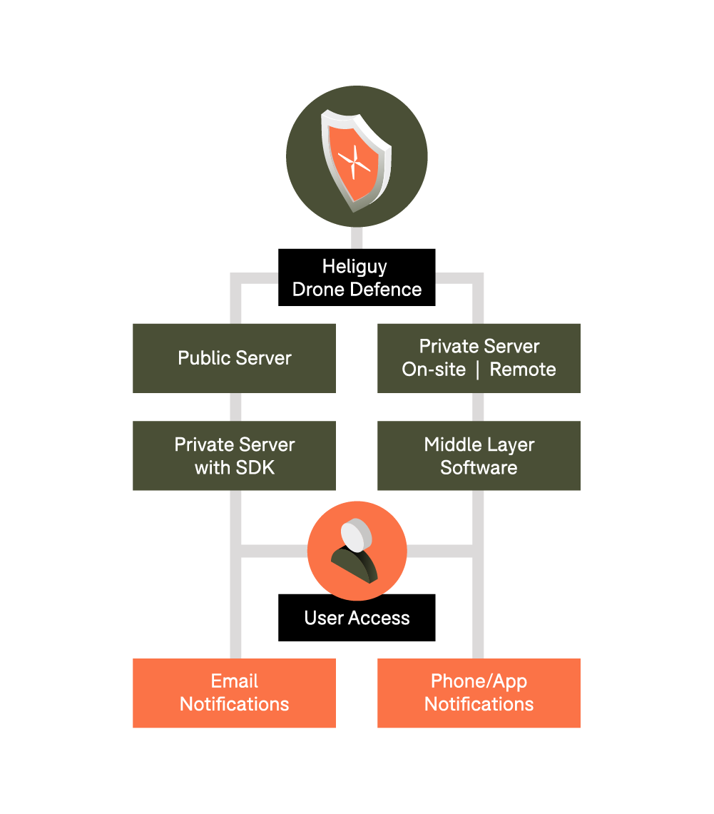 heliguy™ drone defence solutions offer a versatile network topology - effective for a strategy based on DJI AeroScope alone, or utilising AeroScope as part of a layered approach. This topology enables different server options. DJI Aeroscope can feed into a public or private server (on-site or remote) and alert notifications via email and app can be enabled. Alternatively, it can feed into a private server with SDK (Software Development Kit), or a middle-layer software, to enable a multi-tiered approach and enhanced alert methods, such as via dedicated apps.