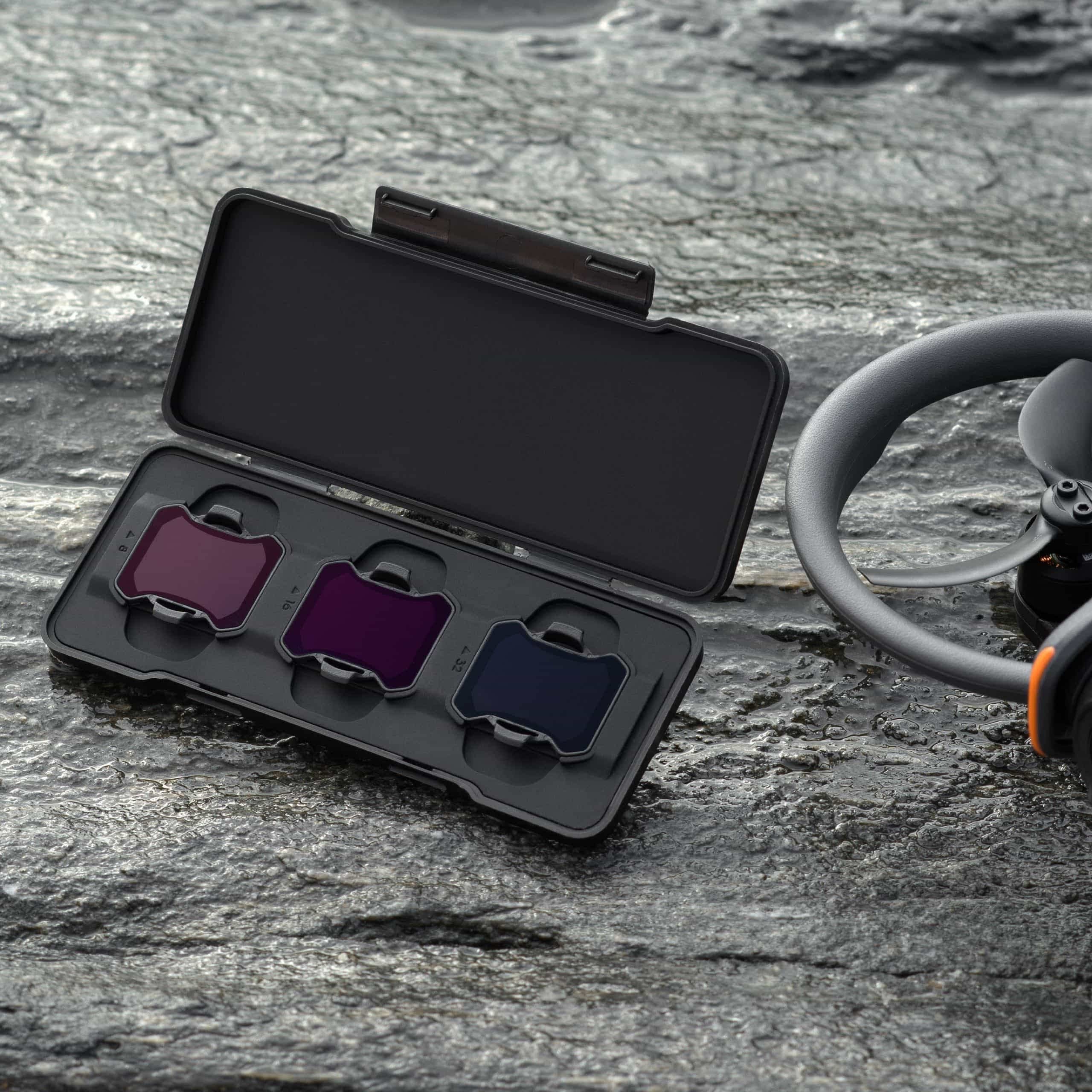 The DJI Avata 2 ND Filters Set includes ND8, ND16, and ND32 filters, providing greater control over aperture and shutter speed for capturing stunning shots like motion blur.