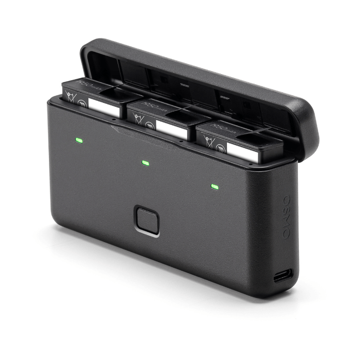 The DJI Osmo Multifunctional Battery Case 3 stores three batteries and two microSD cards.