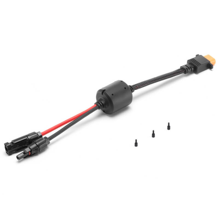 The DJI Power 1.8kW Super Fast Charger MC4 Expansion Cable converts the XT90 Car/Solar Charging Port to an MC4 connector. When used with the built-in MC4 cable, it supports a total solar input of up to 1800W for fast, efficient charging.